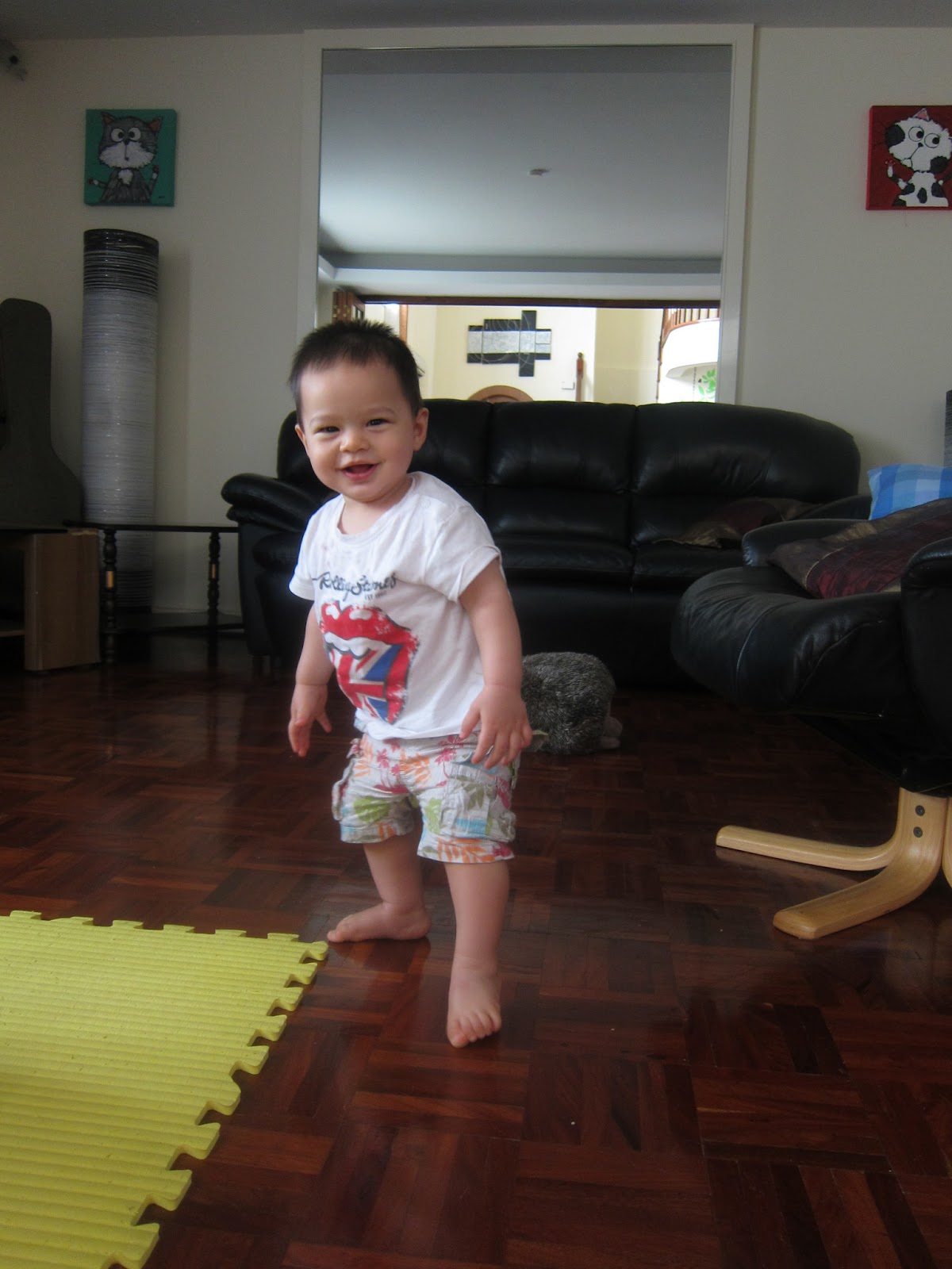 He kisses plush toys whenever he sees them, but refuses to give kisses to us when we ask for it. He loves waving bye. He is eating a lot more in terms of portion size and much more than what Spud used to eat when she was one (fingers x), and has so far has not shown any signs of slowing down. He is all energy and plays all day; practicing his sprints and climbing in and out of the toy box. He is also not showing any signs of slowing down.