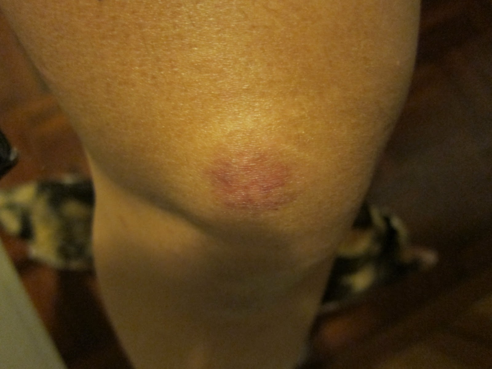 After 3 days, my knee still bulges out a bit, and the colour of the bruise has become much, much more prominent. Still pretty painful. Another battle scar…oh well! 🙂