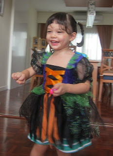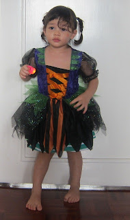 Spud had her first Halloween today, mainly at the request of her school about a week ago to turn up for the day all dressed up in some Halloween garb. She was quite hesitant with the costume at first, and only when we dropped her off in school, did she allow me to put it on her. Perhaps she was inspired to flaunt her pixie-like looking dress after seeing all her friends with their little fancy costumes!