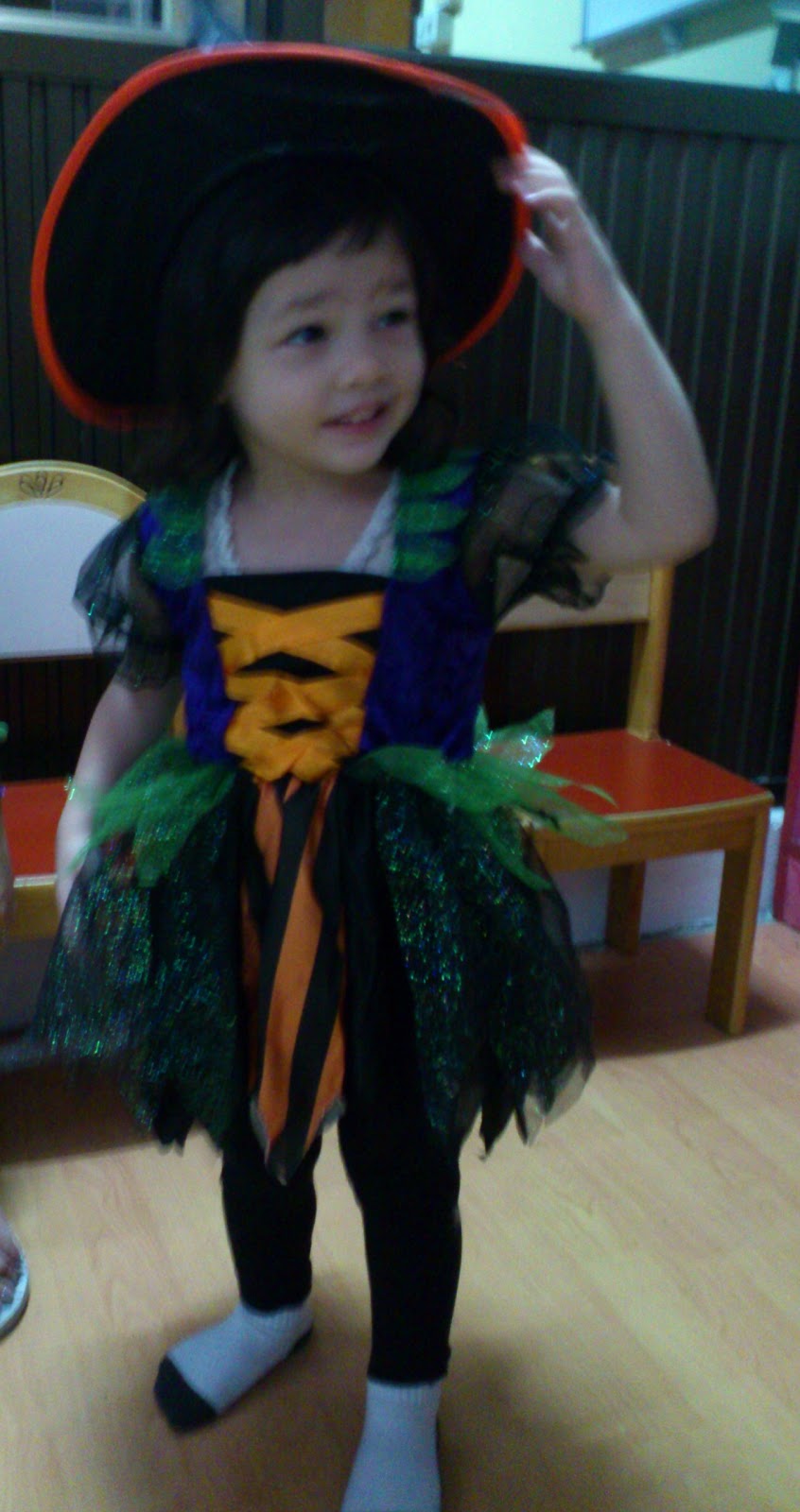 Spud had her first Halloween today, mainly at the request of her school about a week ago to turn up for the day all dressed up in some Halloween garb. She was quite hesitant with the costume at first, and only when we dropped her off in school, did she allow me to put it on her. Perhaps she was inspired to flaunt her pixie-like looking dress after seeing all her friends with their little fancy costumes!