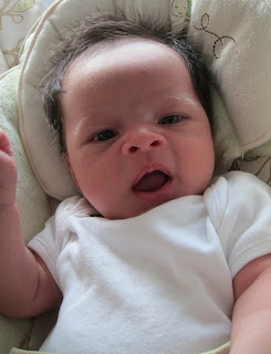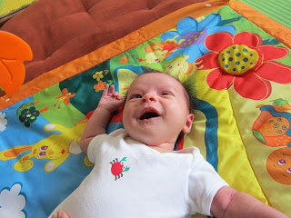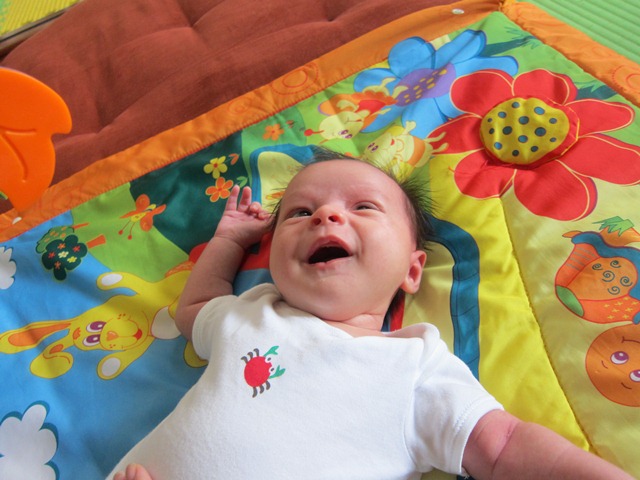 He is certainly looking less wrinkly and quite the wriggler – just like he was when he was still in my tummy. He is still a little bit of a Mr. Floppy Head, but is able to lift his head more.