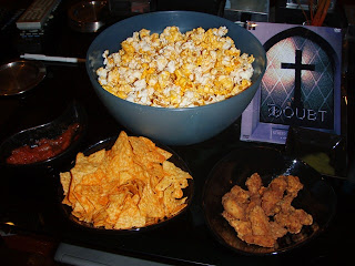Home-popped cheese popcorn, our 1st movie of the night – “Doubt”, Home-made chicken nibblets with hot sauce from Tanzania and Cheesy Nachos with Hot Salsa sauce.