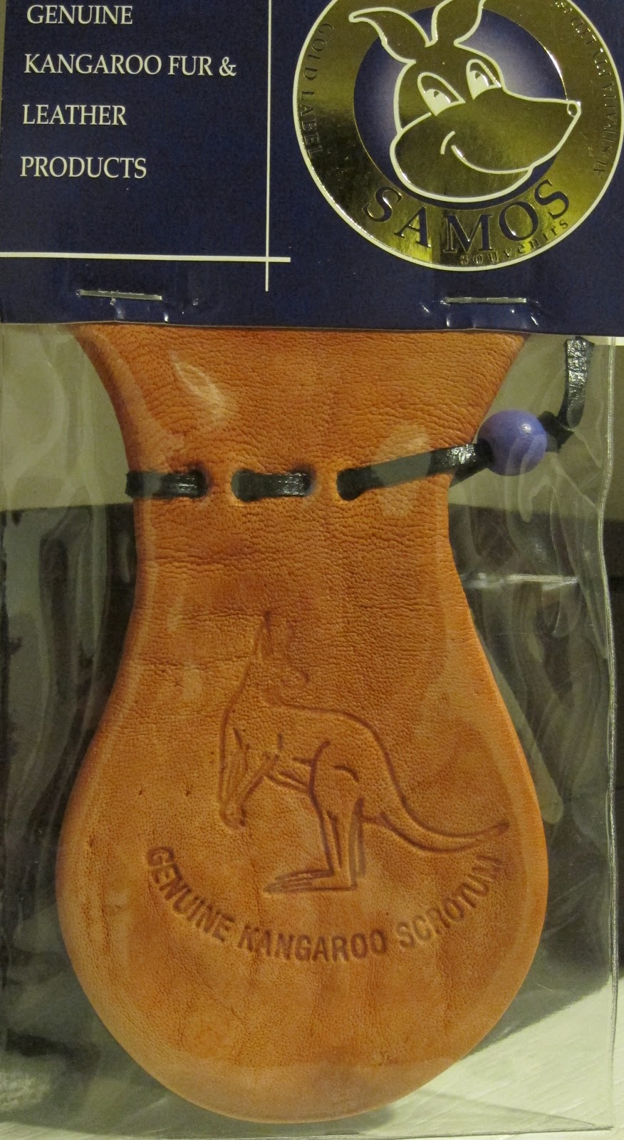 As I scrutinized it carefully, I realized the embossed words on the leather pouch read as “Genuine Kangaroo Scrotum”.