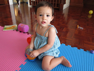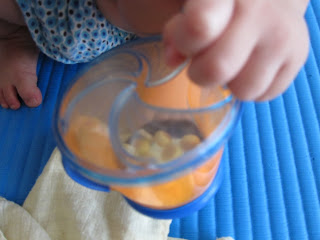 So we bought this Munchkin Snack Catcher container and discovered that not only does it keep its contents in place, it is also quite a novel way to distract Spud for when we get stuck in traffic or for when she gets impatient while being strapped in the car-seat. It’s a brilliant invention, this!