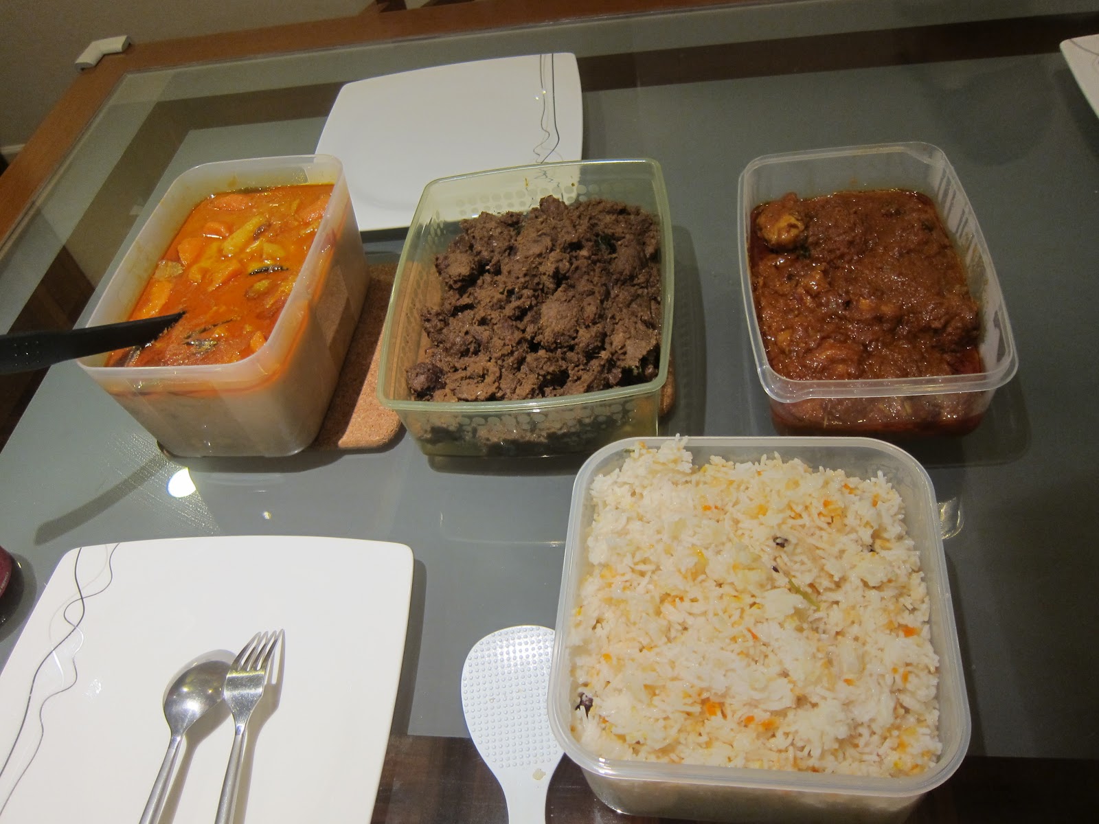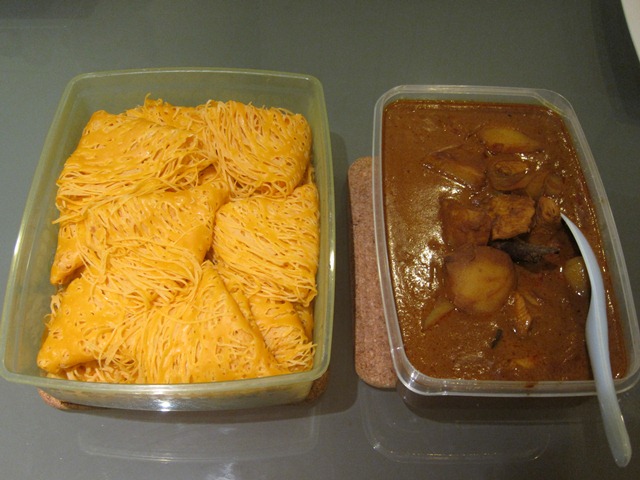 | Nasi Briyani with Vegetable Dalca, Beef Rendang and Chicken in Red Sauce |