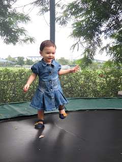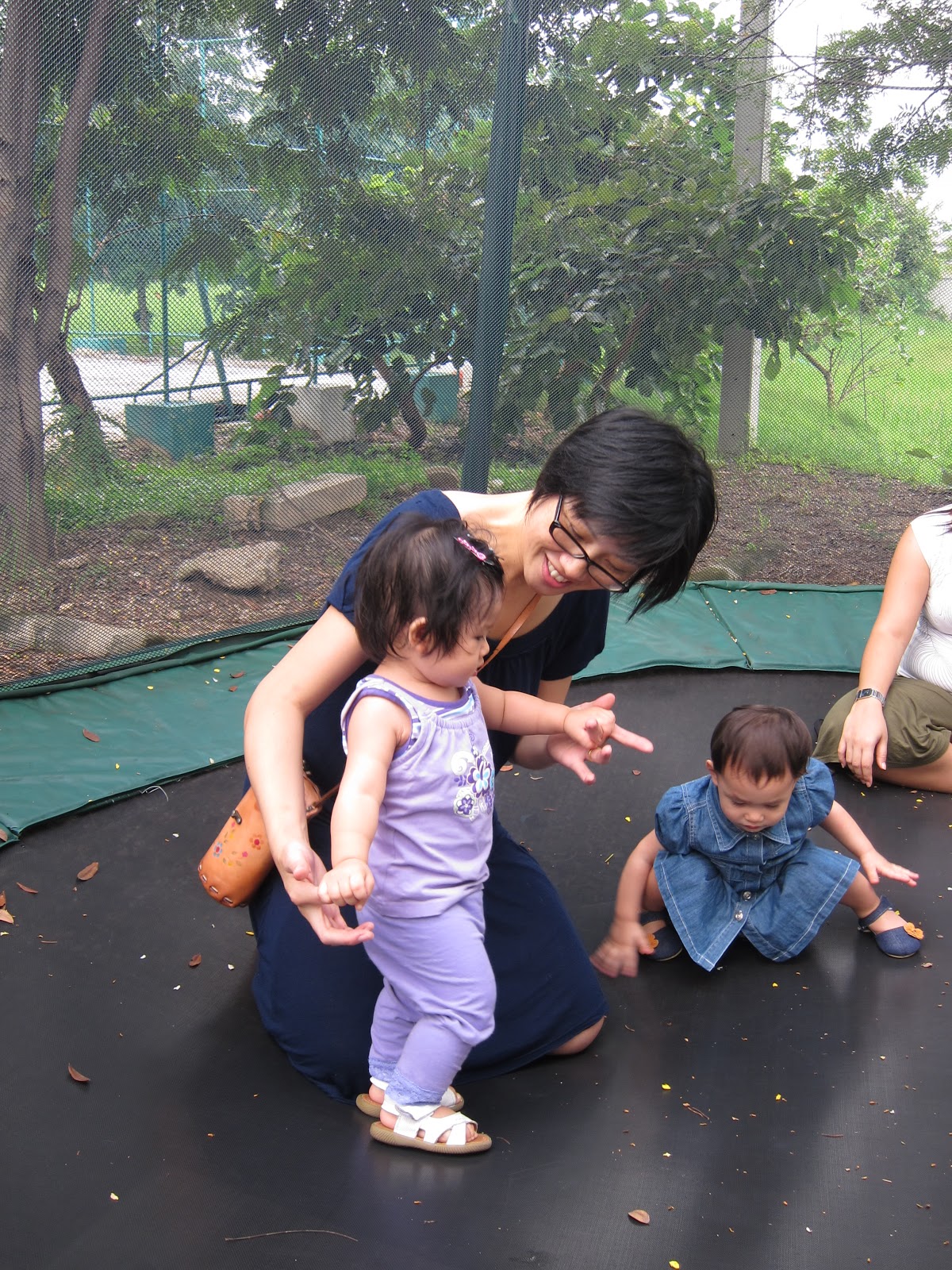 While the other 2 tots were quite apprehensive, Spud just bounced herself off the nettings once she discovered the joy of bouncing off the trampoline. She not only bounced off the nets, she bounced off Moms and the other 2 tots too! I reckon she did that continuously for a good half an hour, bouncing around like a jumping bean. She really was having fun, and here are a few candid shots of her that day: